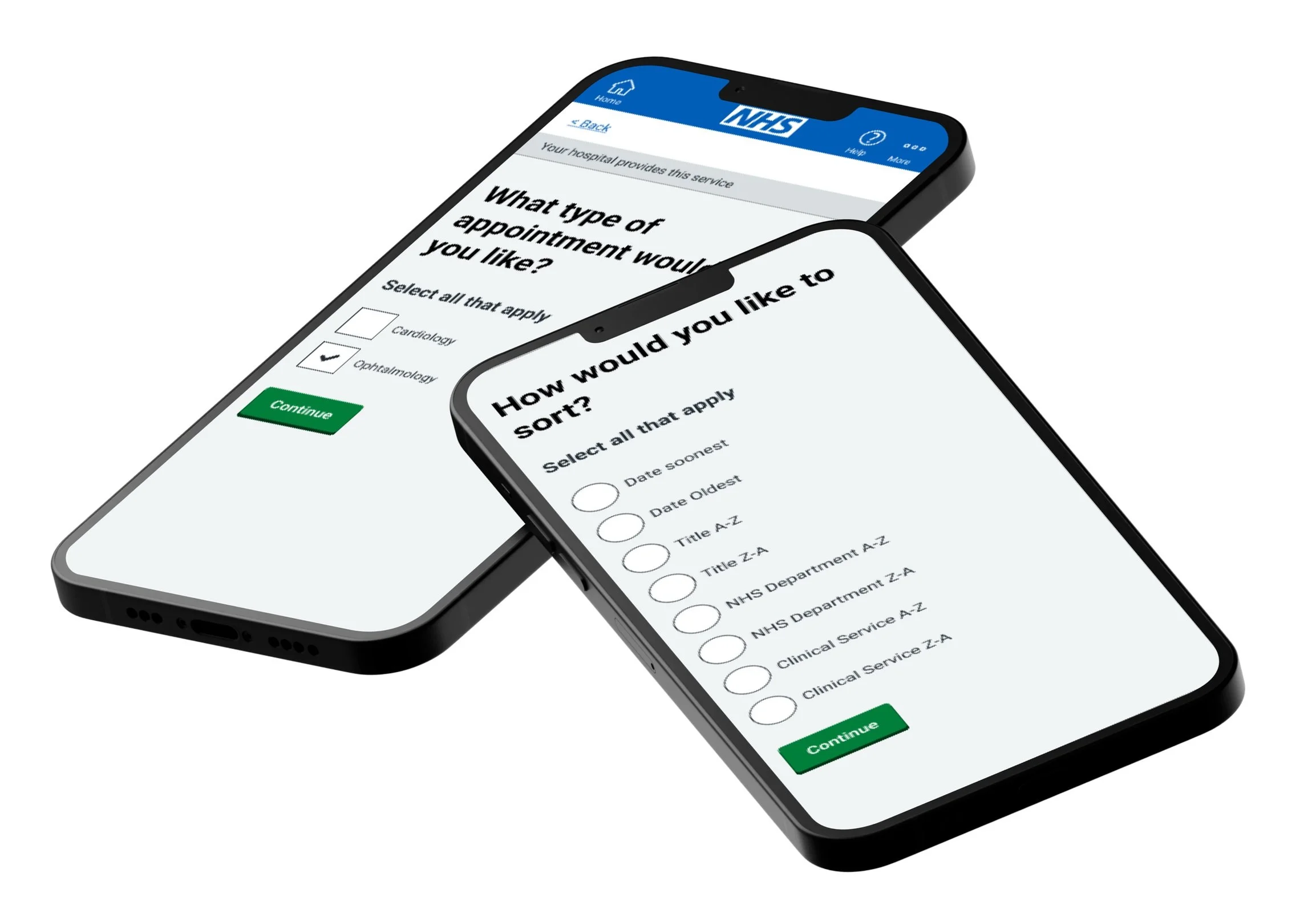 These screens support users in finding the right appointment faster through flexible filtering and sorting options. Built with accessibility and GOV.UK Design System standards in mind, the design enables users to narrow results by date, location, service, or department, enhancing control and reducing cognitive load during the search process.