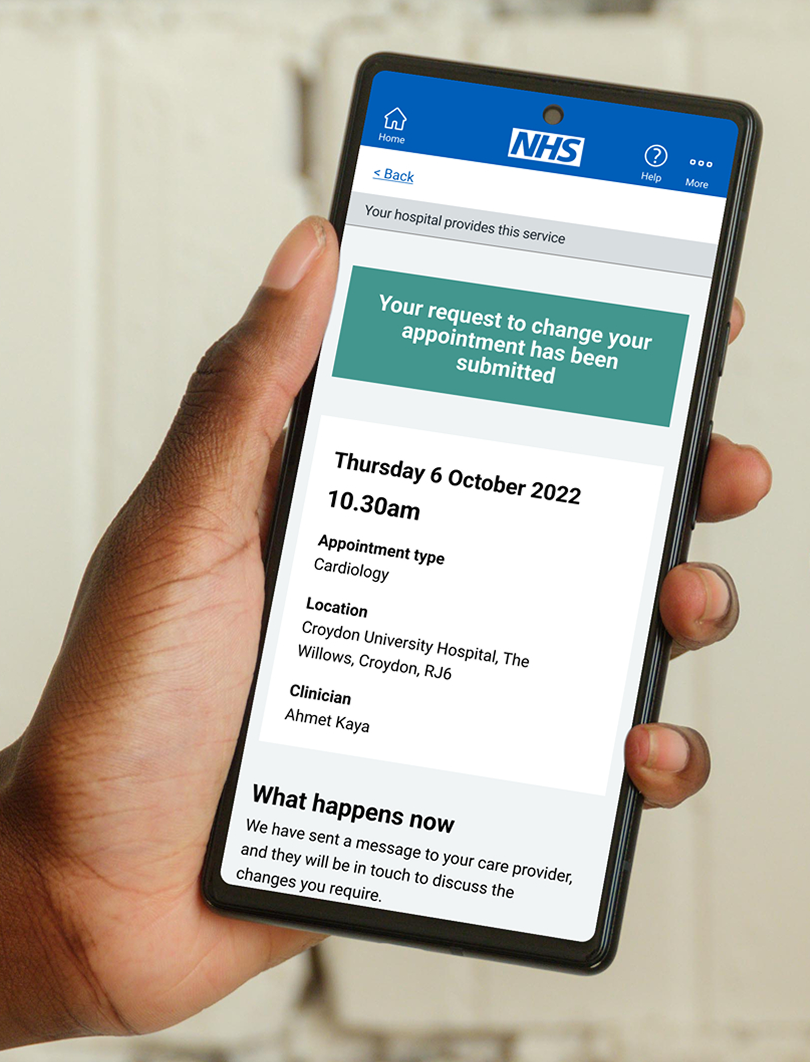 On these screen users can now clearly confirm a submitted appointment change request, using GDS principles for clarity, accessibility, and reassurance. It provides key details, next steps, and support options to guide users confidently.