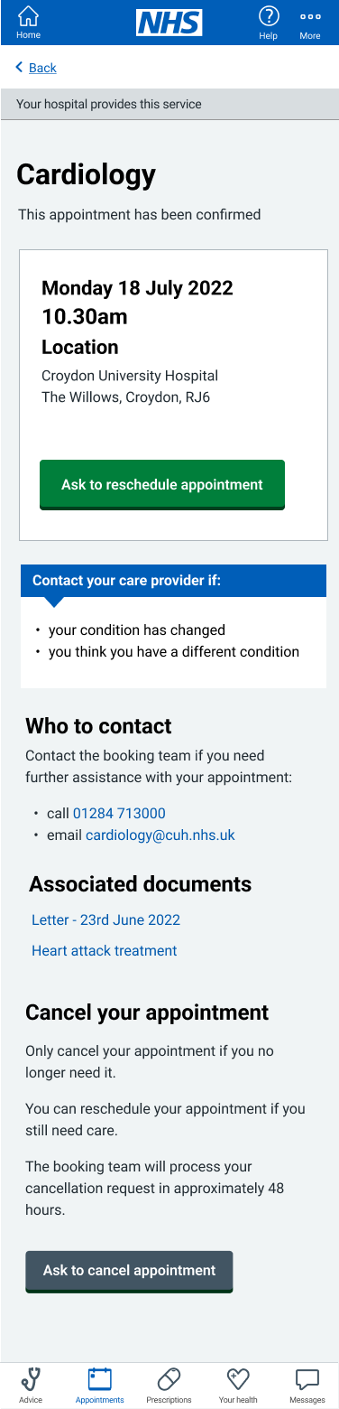 These screens enable users to easily respond to appointment changes by confirming attendance or requesting to reschedule. Built using GDS principles, the interface ensures clarity, accessibility, and straightforward decision-making. The design reduces friction for users while supporting NHS goals to minimise no-shows and improve communication between patients and providers.